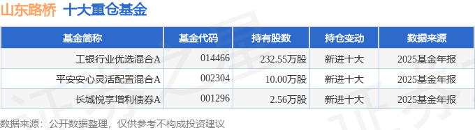 持有山东路桥最多的基金为工银行业优选混合A,目前规模为2.33亿元,最新净值1.0516(4月17日),较上一交易日上涨0.0%,近一年上涨47.76%。该基金现任基金经理为母亚干。