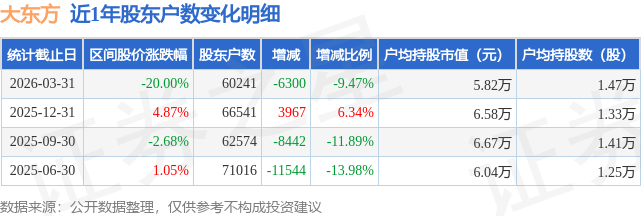 从股价来看,2025年12月31日至2026年3月31日,大东方区间跌幅为20.0%,在此期间股东户数减少6300.0户,减幅为9.47%。