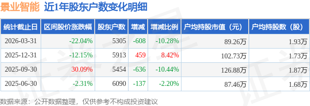从股价来看,2025年12月31日至2026年3月31日,景业智能区间跌幅为22.04%,在此期间股东户数减少608.0户,减幅为10.28%。