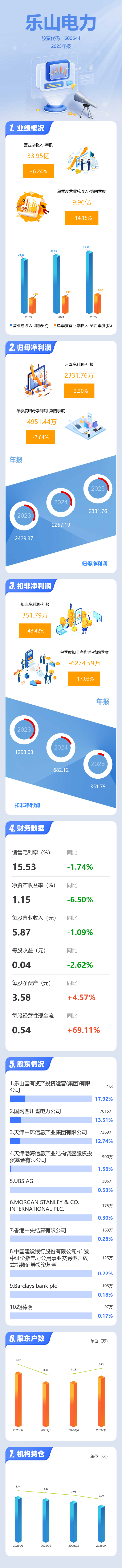 证券之星消息,乐山电力2025年年报显示,当年度公司主营收入33.95亿元,同比上升6.24%;归母净利润2331.76万元,同比上升3.3%;扣非净利润351.79万元,同比下降48.43%;其中2025年第四季度,公司单季度主营收入9.96亿元,同比上升14.16%;单季度归母净利润-4951.44万元,同比下降7.65%;单季度扣非净利润-6274.59万元,同比下降17.04%;负债率51.17%,投资收益2360.52万元,财务费用1729.74万元,毛利率15.53%。
