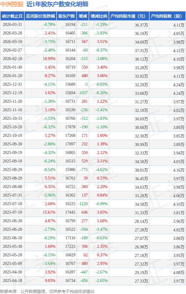 从股价来看,2026年3月20日至2026年3月31日,中洲控股区间跌幅为0.78%,在此期间股东户数减少211.0户,减幅为1.29%。