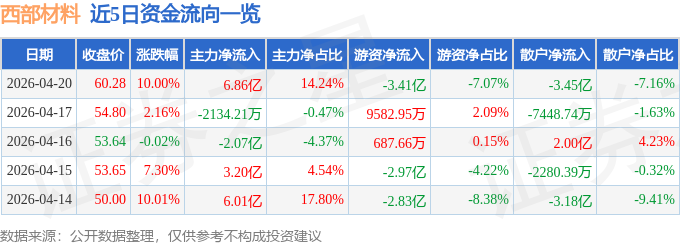 证券之星消息,西部材料4月20日涨停收盘,收盘价60.28元。该股于9点56分涨停,2次打开涨停,截止收盘封单资金为1.95亿元,占其流通市值0.66%。