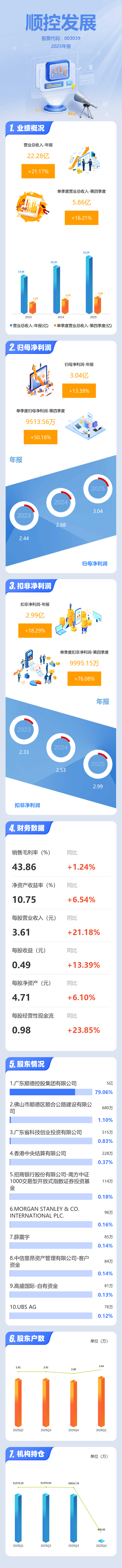 证券之星消息,顺控发展2025年年报显示,当年度公司主营收入22.28亿元,同比上升21.18%;归母净利润3.04亿元,同比上升13.4%;扣非净利润2.99亿元,同比上升18.3%;其中2025年第四季度,公司单季度主营收入5.86亿元,同比上升16.22%;单季度归母净利润9513.56万元,同比上升50.18%;单季度扣非净利润9995.15万元,同比上升76.08%;负债率52.62%,投资收益-679.59万元,财务费用6342.39万元,毛利率43.86%。