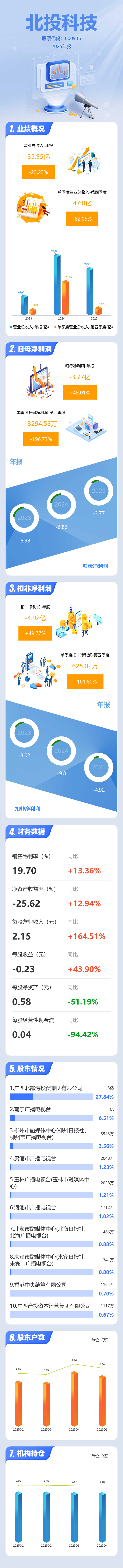 证券之星消息,北投科技2025年年报显示,当年度公司主营收入35.95亿元,同比下降23.23%;归母净利润-3.77亿元,同比上升45.01%;扣非净利润-4.92亿元,同比上升49.78%;其中2025年第四季度,公司单季度主营收入4.6亿元,同比下降82.05%;单季度归母净利润-3294.53万元,同比下降196.74%;单季度扣非净利润625.02万元,同比上升101.8%;负债率68.81%,投资收益-726.83万元,财务费用1.11亿元,毛利率19.7%。