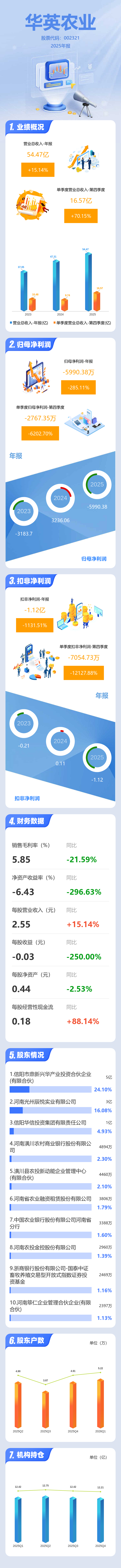 证券之星消息,华英农业2025年年报显示,当年度公司主营收入54.47亿元,同比上升15.15%;归母净利润-5990.38万元,同比下降285.11%;扣非净利润-1.12亿元,同比下降1131.51%;其中2025年第四季度,公司单季度主营收入16.57亿元,同比上升70.16%;单季度归母净利润-2767.35万元,同比下降6202.71%;单季度扣非净利润-7054.73万元,同比下降12127.88%;负债率63.36%,投资收益543.65万元,财务费用7005.6万元,毛利率5.85%。