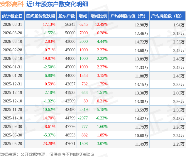 从股价来看,2026年3月20日至2026年3月31日,安彩高科区间涨幅为17.13%,在此期间股东户数增加6245.0户,增幅为12.49%。