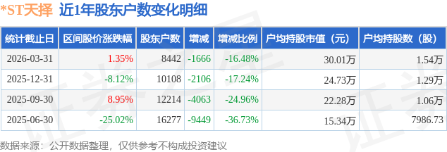 从股价来看,2025年12月31日至2026年3月31日,*ST天择区间涨幅为1.35%,在此期间股东户数减少1666.0户,减幅为16.48%。