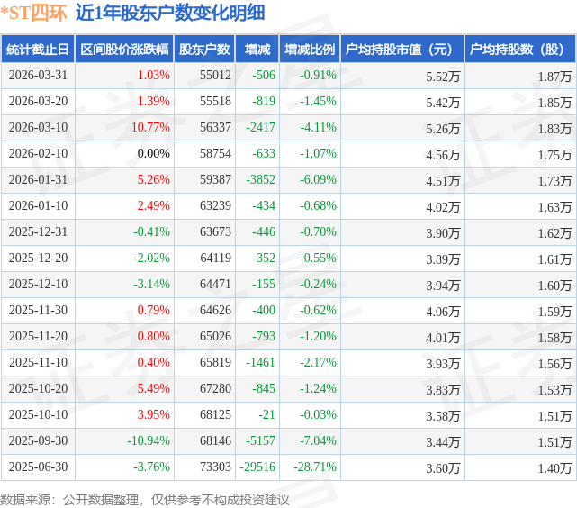从股价来看,2026年3月20日至2026年3月31日,*ST四环区间涨幅为1.03%,在此期间股东户数减少506.0户,减幅为0.91%。
