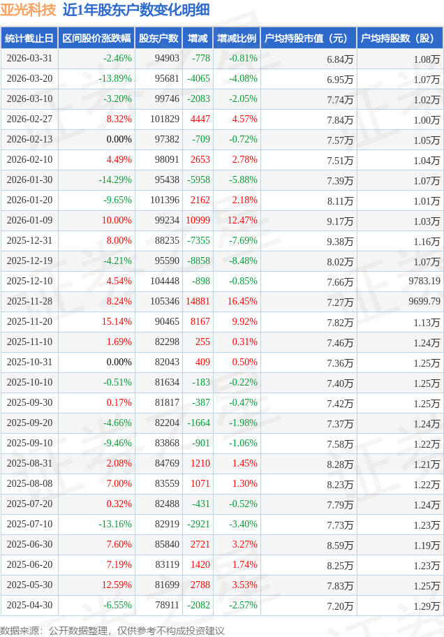 从股价来看,2026年3月20日至2026年3月31日,亚光科技区间跌幅为2.46%,在此期间股东户数减少778.0户,减幅为0.81%。