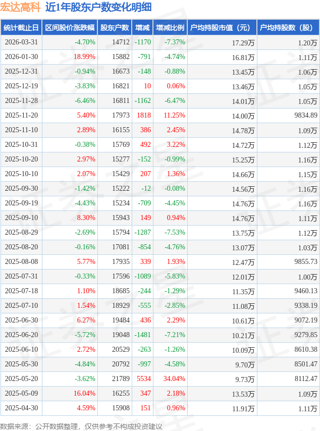 证券之星消息,近日宏达高科披露,截至2026年3月31日公司股东户数为1.47万户,较1月30日减少1170.0户,减幅为7.37%。户均持股数量由上期的1.11万股增加至1.2万股,户均持股市值为17.29万元。