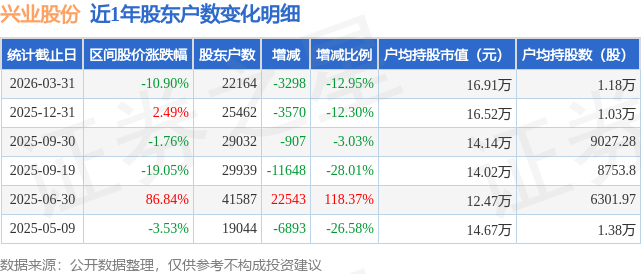 证券之星消息,近日兴业股份披露,截至2026年3月31日公司股东户数为2.22万户,较12月31日减少3298.0户,减幅为12.95%。户均持股数量由上期的1.03万股增加至1.18万股,户均持股市值为16.91万元。