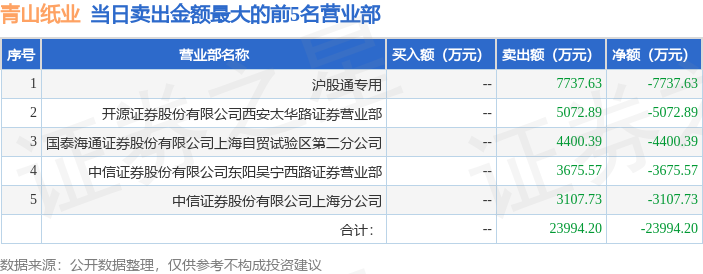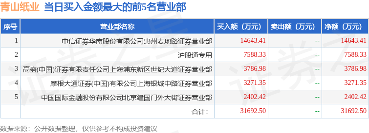 证券之星消息,沪深交易所2026年4月20日公布的交易公开信息显示,青山纸业(600103)因有价格涨跌幅限制的日换手率达到20%的前五只证券登上龙虎榜。此次是近5个交易日内第1次上榜。