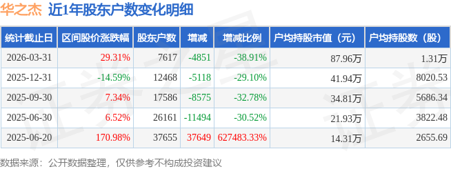 从股价来看,2025年12月31日至2026年3月31日,华之杰区间涨幅为29.31%,在此期间股东户数减少4851.0户,减幅为38.91%。