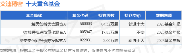 根据2025基金年报公募基金重仓股数据,重仓该股的公募基金共3家,其中持有数量最多的公募基金为益民基金的益民创新优势混合A。益民创新优势混合A目前规模为4.04亿元,最新净值1.3947(4月17日),较上一交易日上涨0.38%,近一年上涨14.85%。该公募基金现任基金经理为张婷 马泉林。张婷在任的基金产品包括:益民优势安享混合A,管理时间为2024年5月28日至今,期间收益率为48.59%。马泉林在任的基金产品包括:益民优势安享混合A,管理时间为2022年9月5日至今,期间收益率为37.82%;