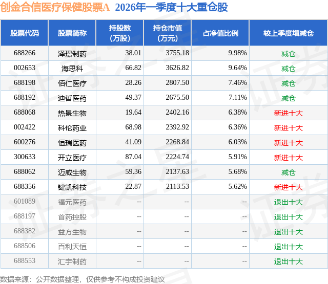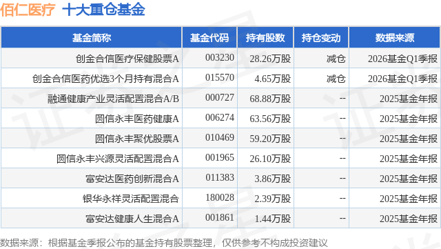 根据2026基金Q1季报公募基金重仓股数据,重仓该股的公募基金共2家,其中持有数量最多的公募基金为创金合信基金的创金合信医疗保健股票A。创金合信医疗保健股票A目前规模为1.71亿元,最新净值1.9864(4月17日),较上一交易日下跌1.7%,近一年上涨16.08%。该公募基金现任基金经理为皮劲松。皮劲松在任的基金产品包括:创金合信大健康混合A,管理时间为2022年1月26日至今,期间收益率为-30.44%;创金合信医药优选3个月持有混合A,管理时间为2022年8月30日至今,期间收益率为-6.54%;创金合信医药消费股票A,管理时间为2025年9月26日至今,期间收益率为-15.09%。