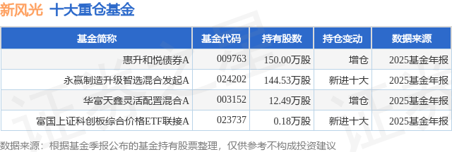 根据2025基金年报公募基金重仓股数据,重仓该股的公募基金共4家,其中持有数量最多的公募基金为惠升基金的惠升和悦债券A。惠升和悦债券A目前规模为43.48亿元,最新净值1.0916(4月17日),较上一交易日上涨0.72%,近一年上涨5.93%。该公募基金现任基金经理为曾华 孙庆。孙庆在任的基金产品包括:惠升和睿兴利债券A,管理时间为2021年3月23日至今,期间收益率为7.68%;惠升惠泽混合A,管理时间为2025年2月6日至今,期间收益率为42.12%;曾华在任的基金产品包括:惠升和赢纯债3个月定开A,管理时间为2022年9月9日至今,期间收益率为11.71%;惠升和裕纯债债券A,管理时间为2022年11月29日至今,期间收益率为12.69%;惠升和怡一年定开债发起式,管理时间为2022年11月29日至今,期间收益率为10.63%。