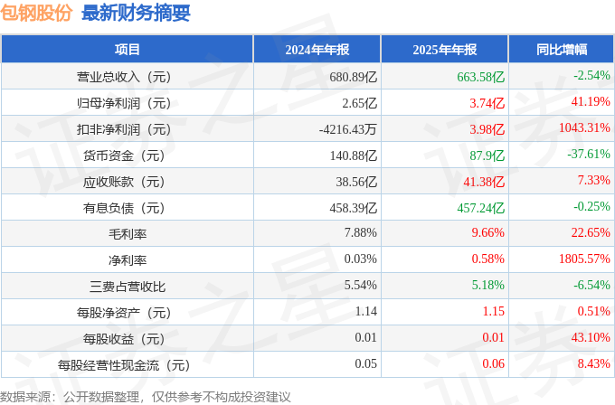 据证券之星公开数据整理,近期包钢股份(600010)发布2025年年报。截至本报告期末,公司营业总收入663.58亿元,同比下降2.54%,归母净利润3.74亿元,同比上升41.19%。按单季度数据看,第四季度营业总收入182.78亿元,同比上升0.29%,第四季度归母净利润1.41亿元,同比下降81.94%。本报告期包钢股份短期债务压力上升,流动比率达0.58。