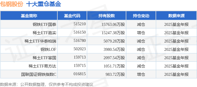 持有包钢股份最多的基金为钢铁ETF国泰,目前规模为39.8亿元,最新净值1.478(4月17日),较上一交易日下跌0.22%,近一年上涨31.14%。该基金现任基金经理为吴中昊。