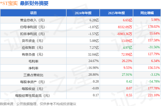 据证券之星公开数据整理,近期*ST宝实(000595)发布2025年年报。截至本报告期末,公司营业总收入6.65亿元,同比上升5.98%,归母净利润8332.09万元,同比上升178.02%。按单季度数据看,第四季度营业总收入1.61亿元,同比上升0.83%,第四季度归母净利润-3451.2万元,同比上升55.43%。本报告期*ST宝实短期债务压力上升,流动比率达0.55。