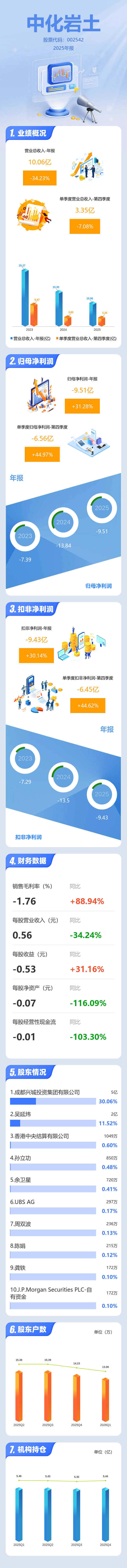 证券之星消息,中化岩土2025年年报显示,当年度公司主营收入10.06亿元,同比下降34.24%;归母净利润-9.51亿元,同比上升31.28%;扣非净利润-9.43亿元,同比上升30.15%;其中2025年第四季度,公司单季度主营收入3.35亿元,同比下降7.09%;单季度归母净利润-6.56亿元,同比上升44.98%;单季度扣非净利润-6.45亿元,同比上升44.62%;负债率102.73%,投资收益20.92万元,财务费用1.33亿元,毛利率-1.76%。