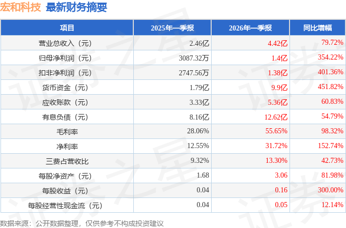据证券之星公开数据整理,近期宏和科技(603256)发布2026年一季报。截至本报告期末,公司营业总收入4.42亿元,同比上升79.72%,归母净利润1.4亿元,同比上升354.22%。按单季度数据看,第一季度营业总收入4.42亿元,同比上升79.72%,第一季度归母净利润1.4亿元,同比上升354.22%。本报告期宏和科技三费占比上升明显,财务费用、销售费用和管理费用总和占总营收同比增幅达42.73%。