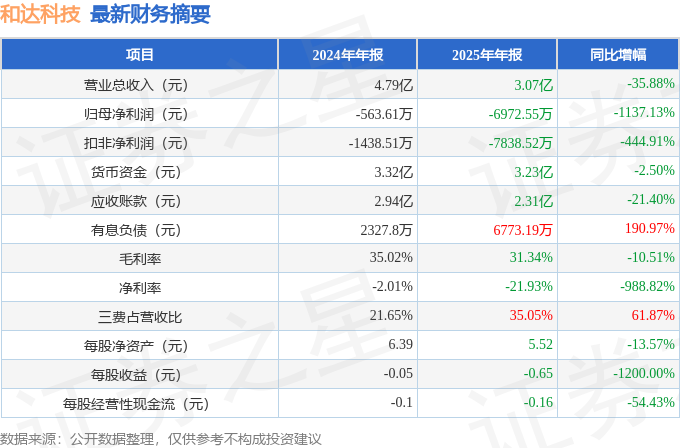 据证券之星公开数据整理,近期和达科技(688296)发布2025年年报。截至本报告期末,公司营业总收入3.07亿元,同比下降35.88%,归母净利润-6972.55万元,同比下降1137.13%。按单季度数据看,第四季度营业总收入1.13亿元,同比下降37.83%,第四季度归母净利润-3345.43万元,同比下降306.87%。本报告期和达科技三费占比上升明显,财务费用、销售费用和管理费用总和占总营收同比增幅达61.87%。