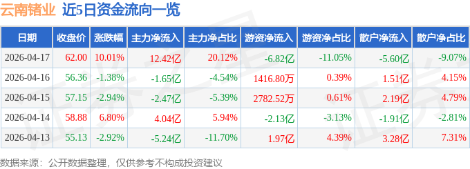 4月17日的资金流向数据方面,主力资金净流入12.42亿元,占总成交额20.12%,游资资金净流出6.82亿元,占总成交额11.05%,散户资金净流出5.6亿元,占总成交额9.07%。