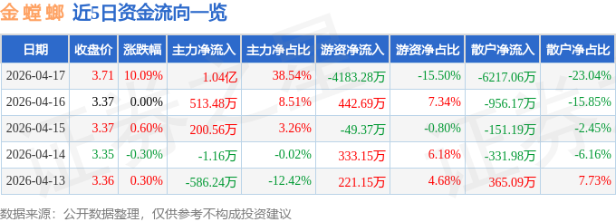 4月17日的资金流向数据方面,主力资金净流入1.04亿元,占总成交额38.54%,游资资金净流出4183.28万元,占总成交额15.5%,散户资金净流出6217.06万元,占总成交额23.04%。