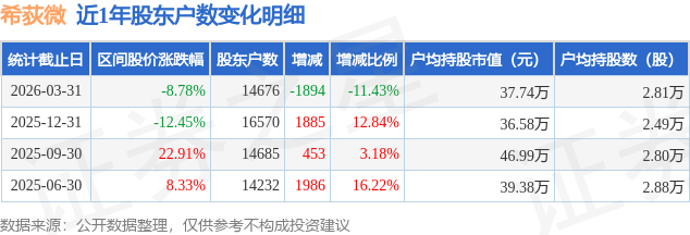 证券之星消息,近日希荻微披露,截至2026年3月31日公司股东户数为1.47万户,较12月31日减少1894.0户,减幅为11.43%。户均持股数量由上期的2.49万股增加至2.81万股,户均持股市值为37.74万元。
