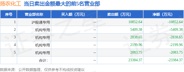 证券之星消息,沪深交易所2026年4月17日公布的交易公开信息显示,扬农化工(600486)因有价格涨跌幅限制的日收盘价格跌幅偏离值达到7%的前五只证券登上龙虎榜。此次是近5个交易日内第1次上榜。