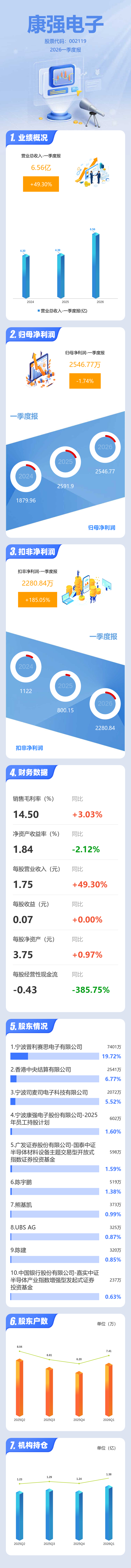 证券之星消息,康强电子2026年一季报显示,一季度公司主营收入6.56亿元,同比上升49.31%;归母净利润2546.77万元,同比下降1.74%;扣非净利润2280.84万元,同比上升185.05%;负债率50.06%,投资收益1734.65万元,财务费用645.34万元,毛利率14.5%。