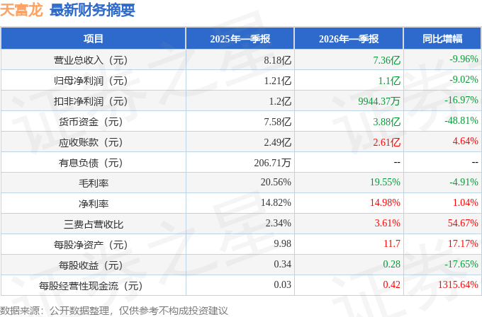 据证券之星公开数据整理,近期天富龙(603406)发布2026年一季报。根据财报显示,天富龙净利润同比下降9.02%。截至本报告期末,公司营业总收入7.36亿元,同比下降9.96%,归母净利润1.1亿元,同比下降9.02%。按单季度数据看,第一季度营业总收入7.36亿元,同比下降9.96%,第一季度归母净利润1.1亿元,同比下降9.02%。