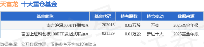 持有天富龙最多的基金为南方沪深300ETF联接A,目前规模为12.77亿元,最新净值1.6301(4月22日),较上一交易日上涨0.7%,近一年上涨27.27%。该基金现任基金经理为罗文杰。