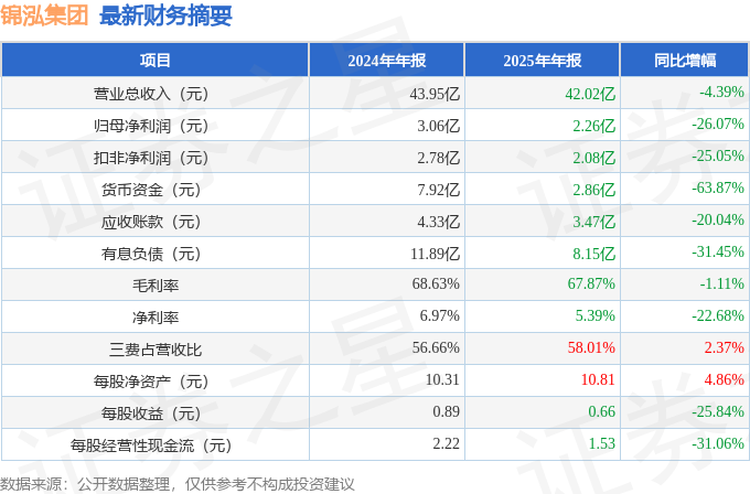 据证券之星公开数据整理,近期锦泓集团(603518)发布2025年年报。根据财报显示,锦泓集团净利润同比下降26.07%,商誉占比较高。截至本报告期末,公司营业总收入42.02亿元,同比下降4.39%,归母净利润2.26亿元,同比下降26.07%。按单季度数据看,第四季度营业总收入13.68亿元,同比下降7.08%,第四季度归母净利润1.12亿元,同比下降22.36%。