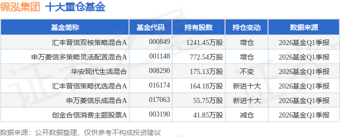 持有锦泓集团最多的基金为汇丰晋信双核策略混合A,目前规模为7.08亿元,最新净值2.0536(4月22日),较上一交易日上涨0.86%,近一年上涨54.7%。该基金现任基金经理为韦钰。