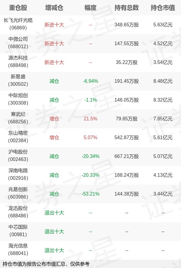 证券之星消息,4月22日富国基金旗下孙权管理的富国新兴产业股票型基金公布一季报,近1年净值增长率107.64%。与上一季度相比,该基金前十大重仓股新增长飞光纤光缆,中微公司,源杰科技;其中新易盛持仓占比9.74%,为该基金第一大重仓股;龙迅股份,中芯国际,海光信息等退出前十大重仓股;详细数据如下:以上内容为证券之星据公开信息整理,由AI算法生成(网信算备310104345710301240019号),不构成投资建议。
