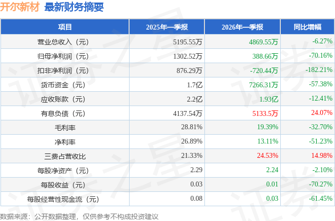 据证券之星公开数据整理,近期开尔新材(300234)发布2026年一季报。截至本报告期末,公司营业总收入4869.55万元,同比下降6.27%,归母净利润388.66万元,同比下降70.16%。按单季度数据看,第一季度营业总收入4869.55万元,同比下降6.27%,第一季度归母净利润388.66万元,同比下降70.16%。本报告期开尔新材公司应收账款体量较大,当期应收账款占最新年报营业总收入比达65.48%。