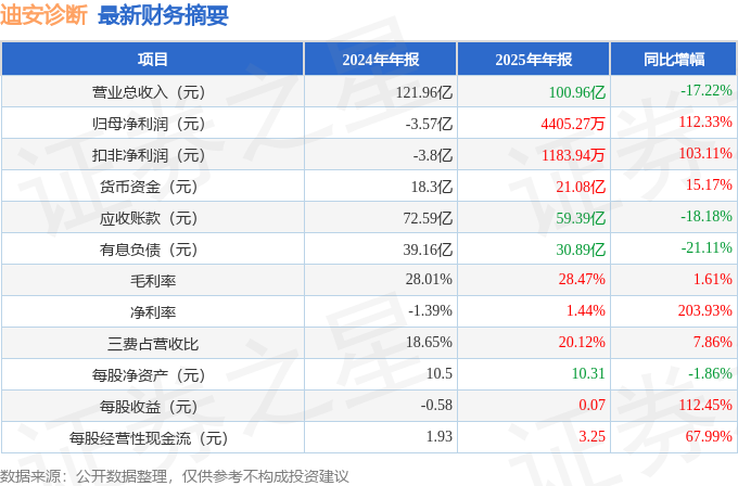 据证券之星公开数据整理,近期迪安诊断(300244)发布2025年年报。截至本报告期末,公司营业总收入100.96亿元,同比下降17.22%,归母净利润4405.27万元,同比上升112.33%。按单季度数据看,第四季度营业总收入25.3亿元,同比下降13.88%,第四季度归母净利润-1265.22万元,同比上升97.41%。本报告期迪安诊断盈利能力上升,毛利率同比增幅1.61%,净利率同比增幅203.93%。