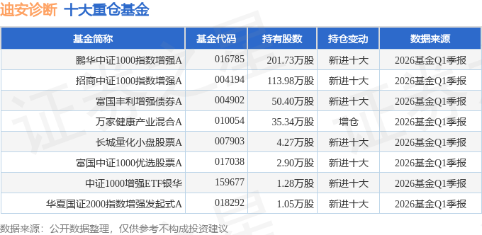持有迪安诊断最多的基金为鹏华中证1000指数增强A,目前规模为20.08亿元,最新净值1.7591(4月22日),较上一交易日上涨1.07%,近一年上涨52.41%。该基金现任基金经理为苏俊杰 时赟超。