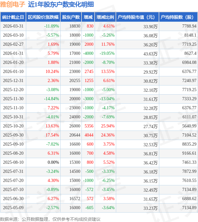 从股价来看,2026年3月20日至2026年3月31日,雅创电子区间跌幅为11.09%,在此期间股东户数增加830.0户,增幅为4.61%。