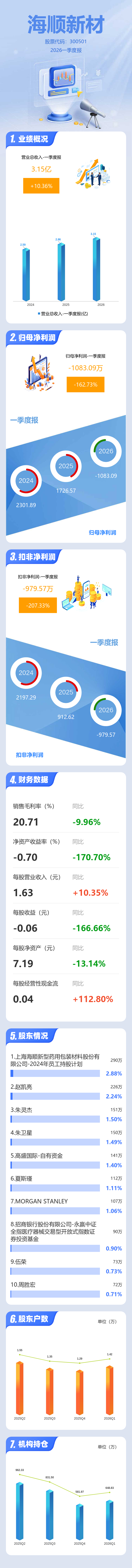 证券之星消息,海顺新材2026年一季报显示,一季度公司主营收入3.15亿元,同比上升10.36%;归母净利润-1083.09万元,同比下降162.73%;扣非净利润-979.57万元,同比下降207.34%;负债率43.53%,投资收益68.61万元,财务费用1163.15万元,毛利率20.71%。