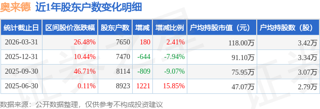 证券之星消息,近日奥来德披露,截至2026年3月31日公司股东户数为7650.0户,较12月31日增加180.0户,增幅为2.41%。户均持股数量由上期的3.34万股增加至3.42万股,户均持股市值为118.0万元。