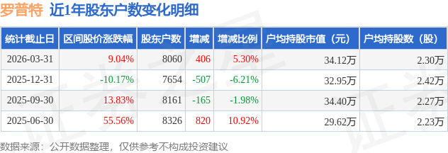 证券之星消息,近日罗普特披露,截至2026年3月31日公司股东户数为8060.0户,较12月31日增加406.0户,增幅为5.3%。户均持股数量由上期的2.42万股减少至2.3万股,户均持股市值为34.12万元。