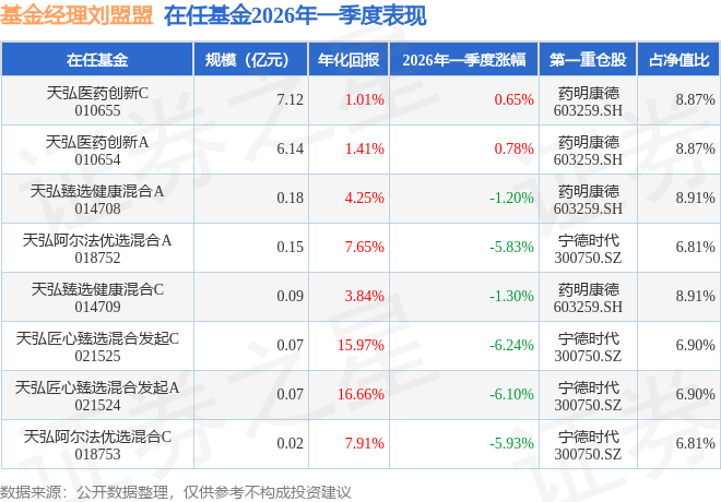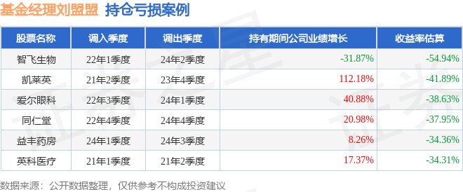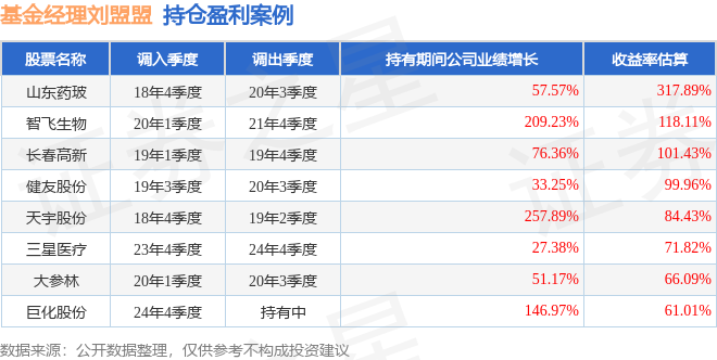 重仓股调仓示例详解:1、山东药玻(600529)翻倍案例:刘盟盟管理的天弘医疗健康混合A基金在18年4季度买入山东药玻,在持有1年又3个季度后在20年3季度卖出。持有期间的估算收益率为317.89%,持有期间山东药玻在2018年到2020年的年报归属净利润增幅达57.57%。2、健友股份(603707)调仓案例:刘盟盟管理的天弘医疗健康混合A基金在19年3季度买入健友股份,在持有1年又0个季度后在20年3季度卖出。持有期间的估算收益率为99.96%,持有期间健友股份在2019年到2020年的年报归属净利润增幅达33.25%。3、智飞生物(300122)折戟案例:刘盟盟管理的天弘医疗健康混合A基金在22年1季度买入智飞生物,在持有2年又1个季度后在24年2季度卖出。持有期间的估算收益率为-54.94%,持有期间智飞生物在2022年到2024年的年报营业总收入降幅为31.87%。