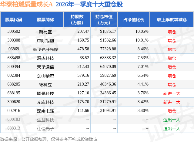 华泰柏瑞质量成长A的前十大重仓股如下: