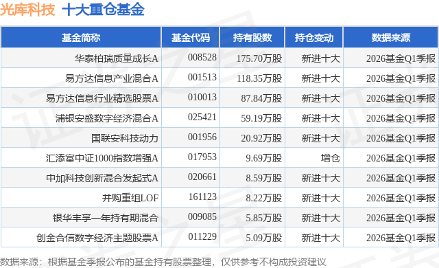 重仓光库科技的前十大公募基金请见下表: