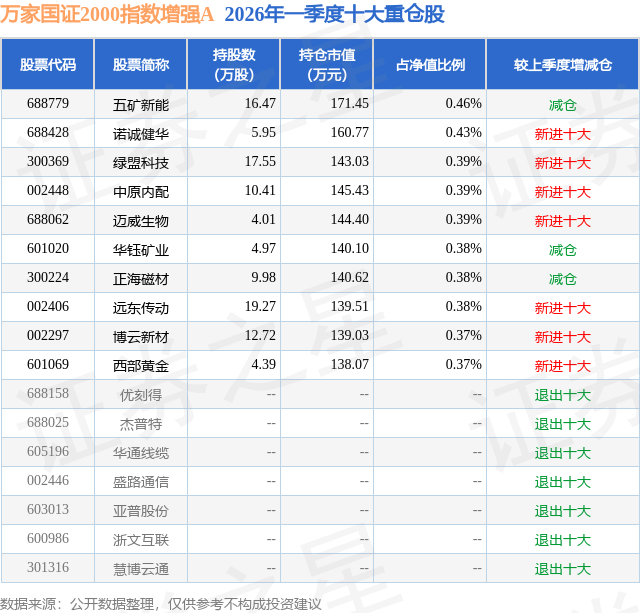 万家国证2000指数增强A的前十大重仓股如下:
