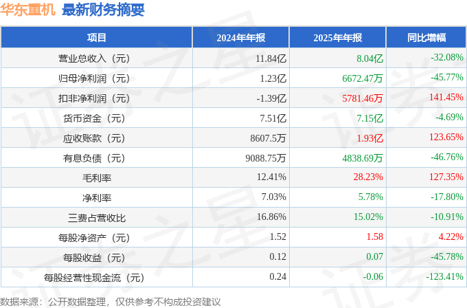 据证券之星公开数据整理,近期华东重机(002685)发布2025年年报。截至本报告期末,公司营业总收入8.04亿元,同比下降32.08%,归母净利润6672.47万元,同比下降45.77%。按单季度数据看,第四季度营业总收入1.99亿元,同比下降21.36%,第四季度归母净利润2671.68万元,同比下降70.05%。本报告期华东重机应收账款上升,应收账款同比增幅达123.65%。