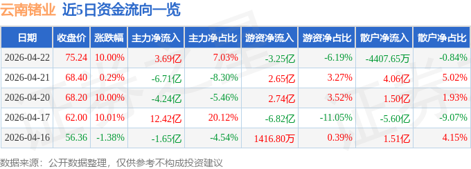 4月22日的资金流向数据方面,主力资金净流入3.69亿元,占总成交额7.03%,游资资金净流出3.25亿元,占总成交额6.19%,散户资金净流出4407.65万元,占总成交额0.84%。