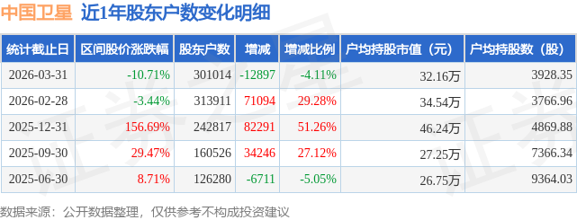 证券之星消息,近日中国卫星披露,截至2026年3月31日公司股东户数为30.1万户,较2月28日减少1.29万户,减幅为4.11%。户均持股数量由上期的3767.0股增加至3928.0股,户均持股市值为32.16万元。